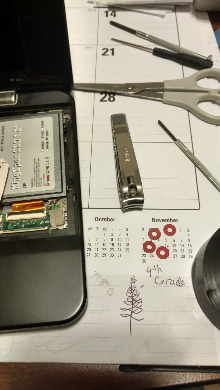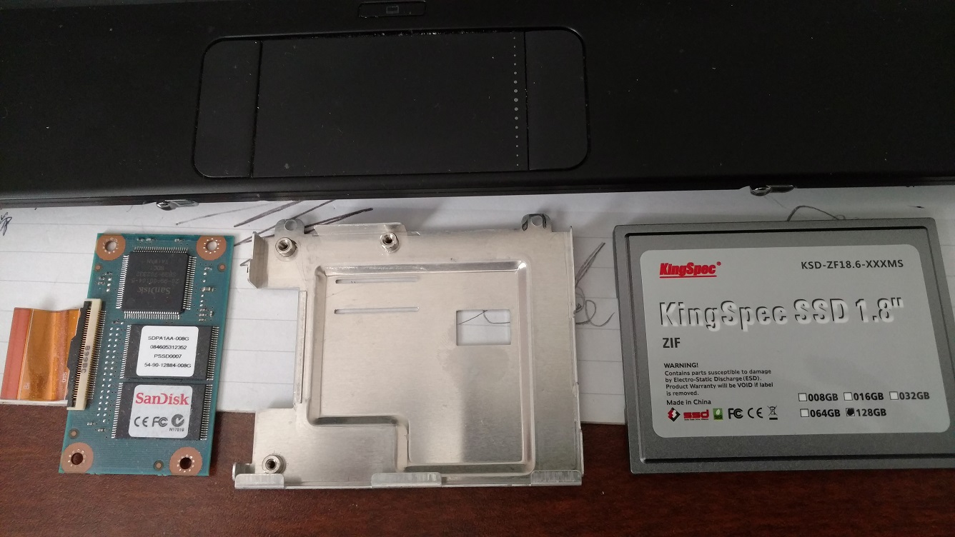 The 1.8″ KingSpec SSD is big enough for the entire bay, so needed to remove the internal USB, unplugged the USB connector, used a plastic pryer to carefully ply off the glued down internal USB. The KingSpec SSD did not come with a ZIF ribbon cable, so needed to reuse the old one, it was hard to fit the cable in the new SSD, tried both ends of the cable, the end marked as “mb” was easier to insert, but still tight, in this process, be very careful that the bare contacts face the contacts in the connector.