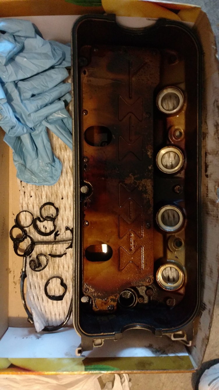 Removed the spark plugs, the connected rubber tube, and the PCV valve, unscrewed 5 bolts which hold down the cover, since it had never been opened, so it was hard to come off, used a flat screw driver to carefully pry along the seam until it loosened up, took it off. Then used the tabs to pull out the gasket