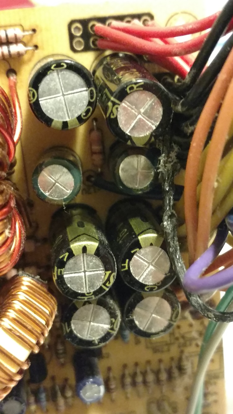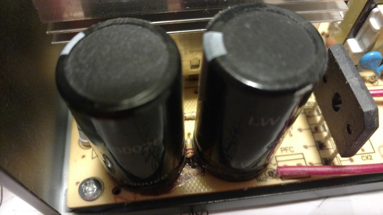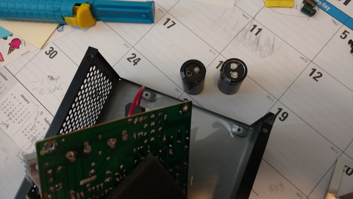 Back in November, 2016, PC died unexpectedly with just some noise from a fan inside. It could be a combination of CPU, mobo, and PSU went wrong, to be on the safe side and get the work horse back in short time, I replaced all 3 of them, along the way, 4GB memory upgrade to bring total to 8GB and a brand new 1T hard drive, so I can reuse the old hard drive someday. But the new mobo is bleeding edge, requires USB3.0 preloaded from OS DVD, so my 2009 Vista Ultimate was obviously out of date, not even windows 7 can do the job, therefore, more money for a new OS – Windows 10 pro, since already spent money on OS, would not mind a couple dozens more for a decent pro version. After all this new PC is up and running happily, I have time to look into the old stuff, first took the PSU apart, found some bulged caps.