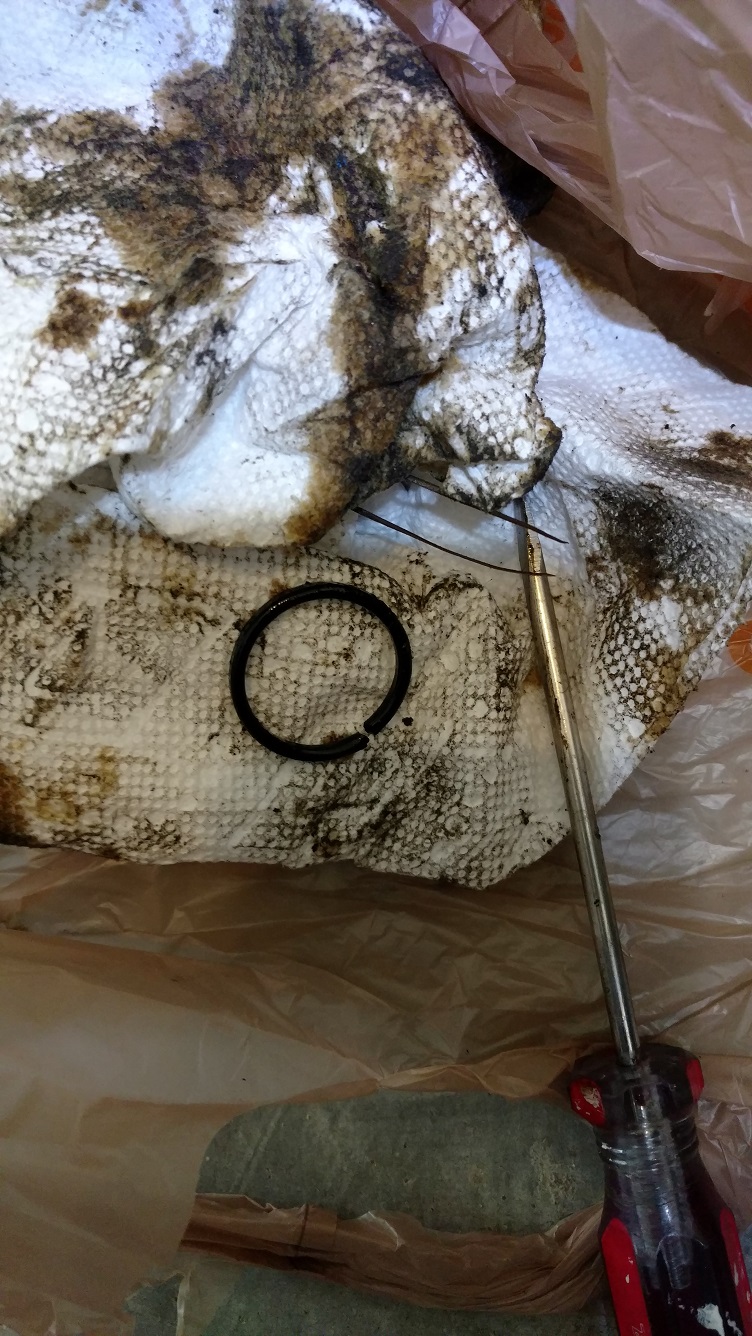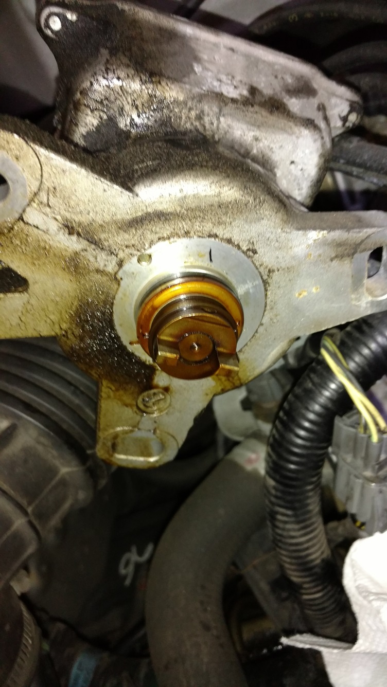 Marked the tip of the crescent shape with a Sharpie to preserve timing, this is very critical in order not to mess up the engine. Cleaned up the leak and surrounding area with paper towels. Used a small flat screw driver to get the old O-Ring out, it is very fragile already, so it was broken when pried on. Put on the new one with ease while there was still engine oil around the axle and itself being flexible.