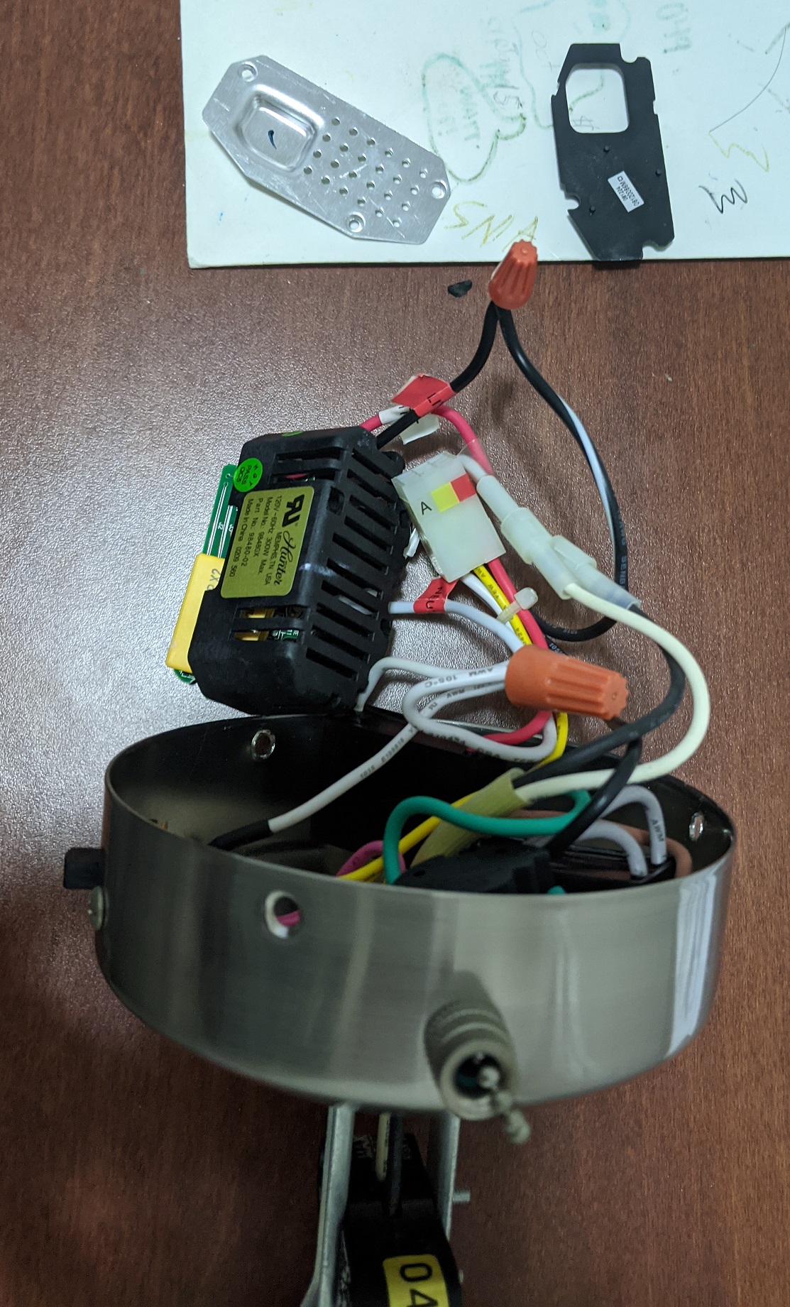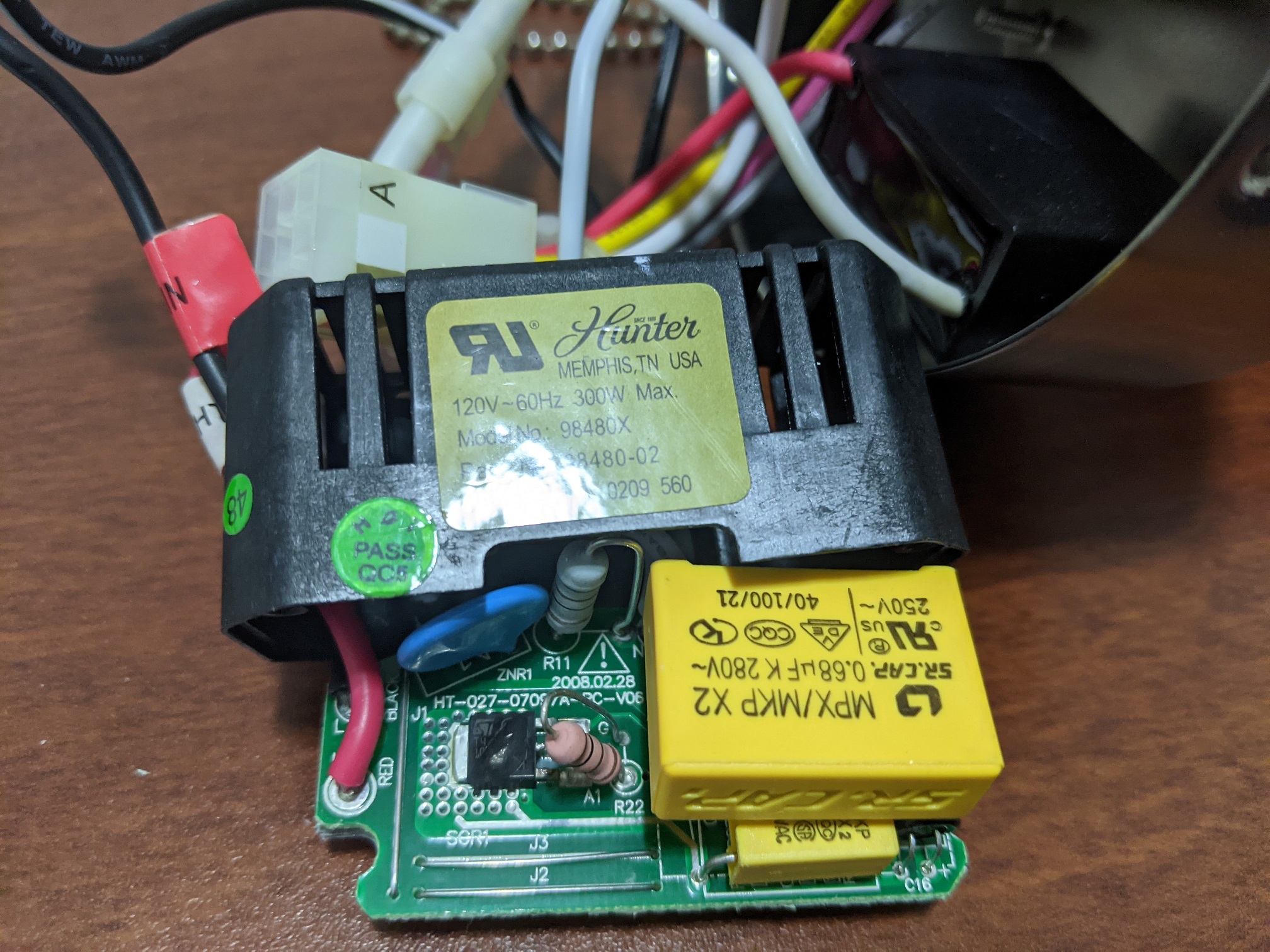 Don’t know when those lights started blinking and got very annoying, switch between different light bulbs and types (regular, CFL, LED), no avail. Tried adjusting socket contacts, tightening wire twist caps, still behaved the same. All led to Hunter’s wattage regulator, open up the light control housing